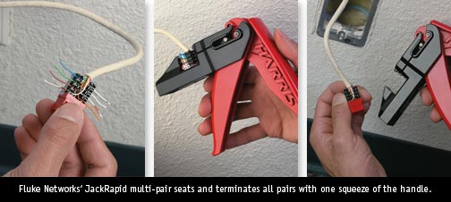 福禄克网络公司的 JackRapid 压线器支持 Systimax 和 Uniprise 插座,包括 Systimax Cat 5e、Uniprise Cat 6 和 Leviton Cat 5e。插座端接技术使您能以比传统冲击型工具快 8 倍的速度来方便地固定和端接插座。